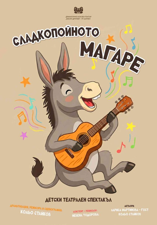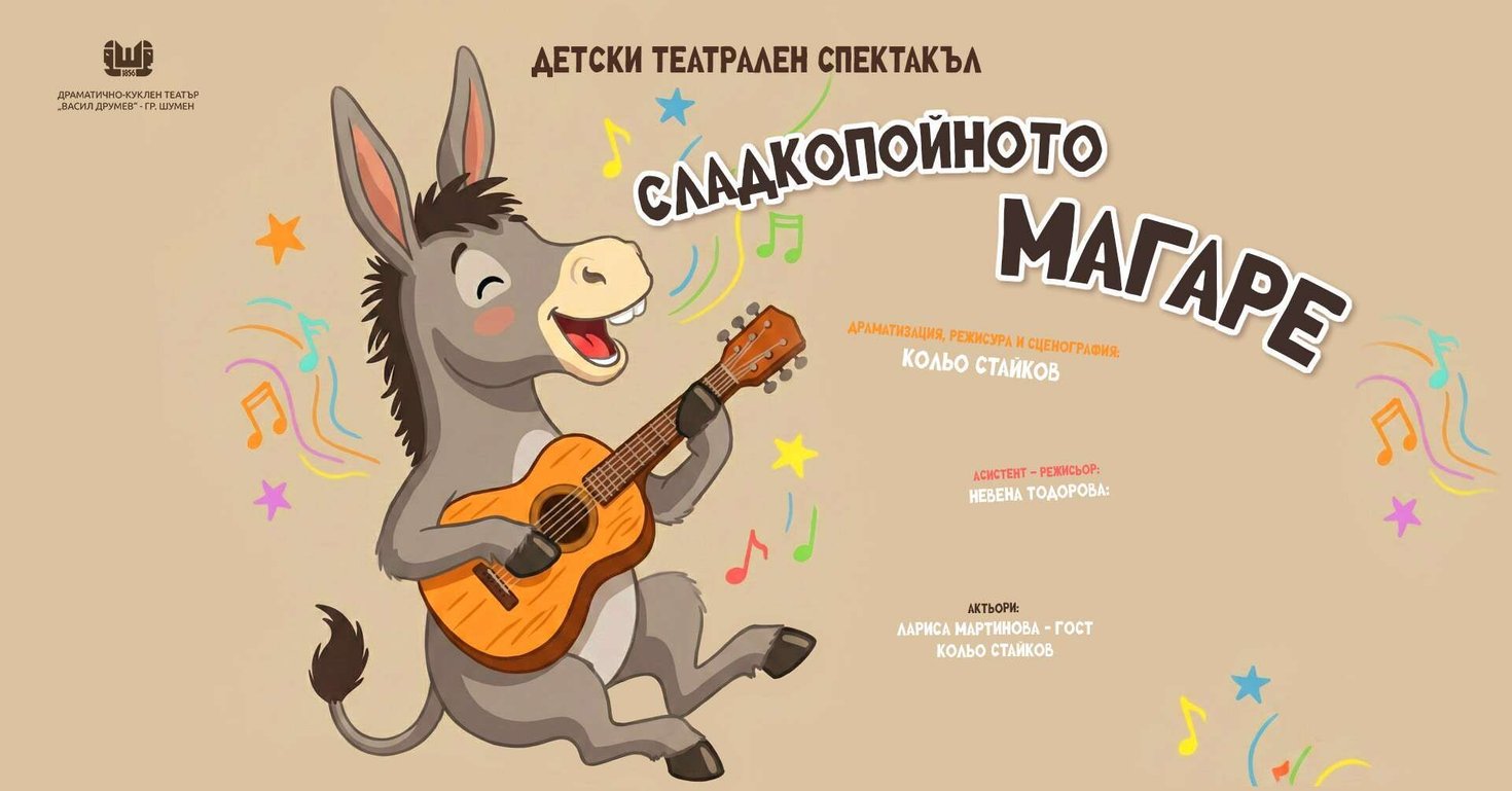 Приказката за „Сладкопойното магаре“ — история, разказана с рисунки и китара. Тя е свързана с приятелството, магарешкия инат и високомерието, с подигравателното отношение към всички и всичко.